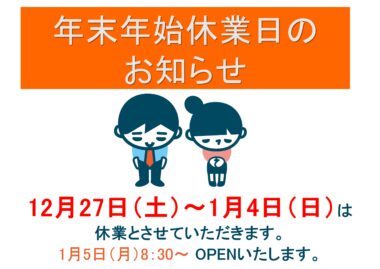 年末年始は2025年12月27日(土)から2026年1月4日(日)まで